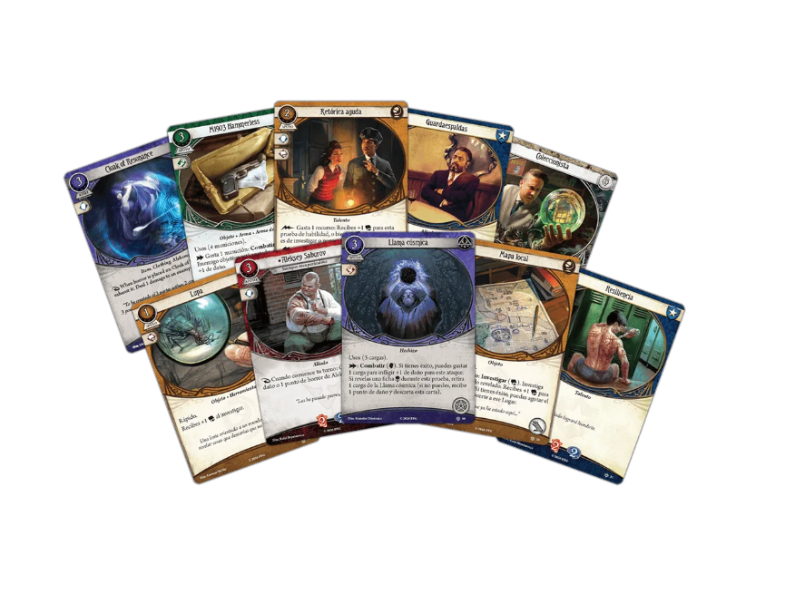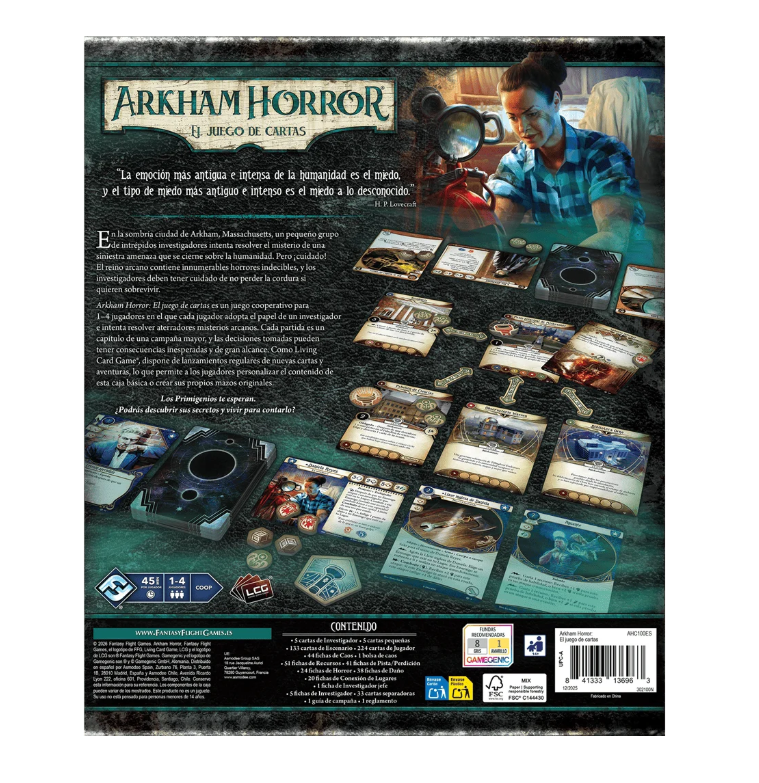 Arkham Horror: El juego de cartas es un juego cooperativo para 1–4 jugadores en el que cada jugador adopta el papel de un investigador e intenta resolver aterradores misterios arcanos. Cada partida es un capítulo de una campaña mayor, y las decisiones tomadas pueden tener consecuencias inesperadas y de gran alcance. Como Living Card Game®, dispone de lanzamientos regulares de nuevas cartas y aventuras, lo que permite a los jugadores personalizar el contenido de esta caja básica o crear sus propios mazos originales.