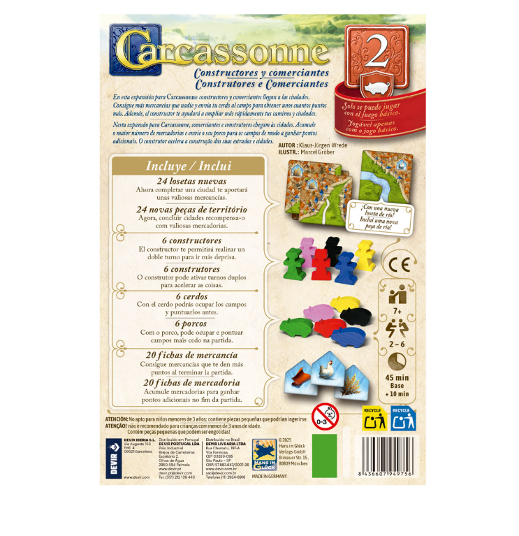 Carcassonne: Constructores y Comerciantes es una expansión para el clásico juego de colocación de losetas Carcassonne. Esta expansión introduce 24 nuevas losetas y piezas de cartón, que representan artículos como vino, tela y trigo, que los jugadores obtendrán colocando seguidores en las losetas con sus respectivos iconos o cerrando ciudades. Al final de la partida, los jugadores que tengan más artículos de cada tipo ganarán 10 puntos de victoria extra. ¡Llega el mundo del comercio a Carcassonne!