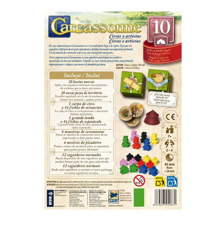 Circos y artistas requiere de la edición básica de Carcassonne para poderse jugar y es perfectamente combinable con otras expansiones del juego. Imprescindible para los amantes del clásico de colocación de losetas de Klaus-Jürgen Wrede, esta expansión añade un nuevo y divertido modo de sumar puntos con tus seguidores. ¡Crea el mejor espectáculo y llévate la victoria!