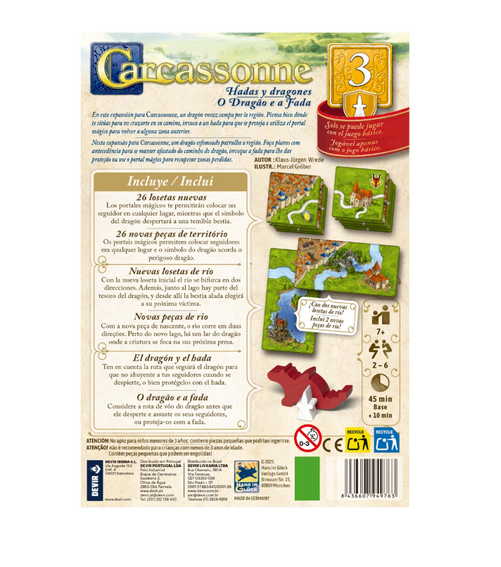Carcassonne: Dragones y Hadas incluye 26 nuevas losetas que se añaden al set básico del juego. En estas nuevas losetas hay portales mágicos, que te permitirán colocar un seguidor en cualquier lugar, pero también símbolos de dragón, que despertarán a una temible bestia que se moverá por las losetas, ahuyentando a los seguidores de los jugadores.