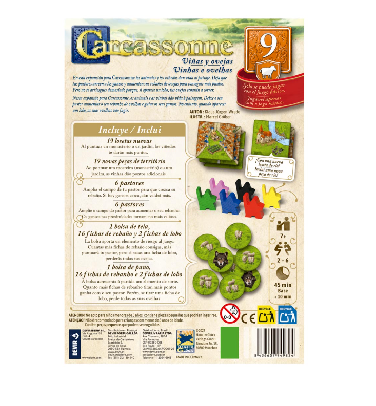 La caja de viñas y ovejas incluye 19 nuevas losetas con viñedos, que dan más valor a monasterios y jardines. También incluye seis peones de pastor (de colores distintos, uno por cada jugador); los pastores darán puntos en función de su rebaño y si hay gansos cerca todavía serán más rentables. Por último, la caja trae una bolsa de tela y 18 fichas (16 de rebaño y 2 de lobo). La bolsa aporta un elemento de riesgo al juego; cuantas más fichas de rebaño consigas, más puntuará tu pastor, pero si sacas una ficha de lobo, perderás todas tus ovejas.