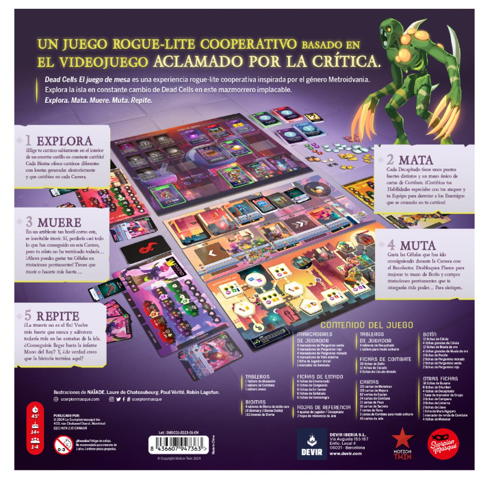 Diseñado por Antoine Bauza, Corentin Lebrat, Ludovic Maublanc y Théo Rivière, Dead Cells propone partidas para grupos de 1 a 4 jugadores, a partir de 14 años, con una duración aproximada de 45 minutos. ¿Serás capaz de romper el ciclo y conquistar la isla… o perderás la cabeza una vez más?