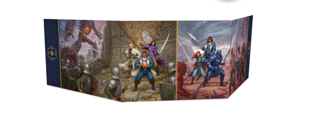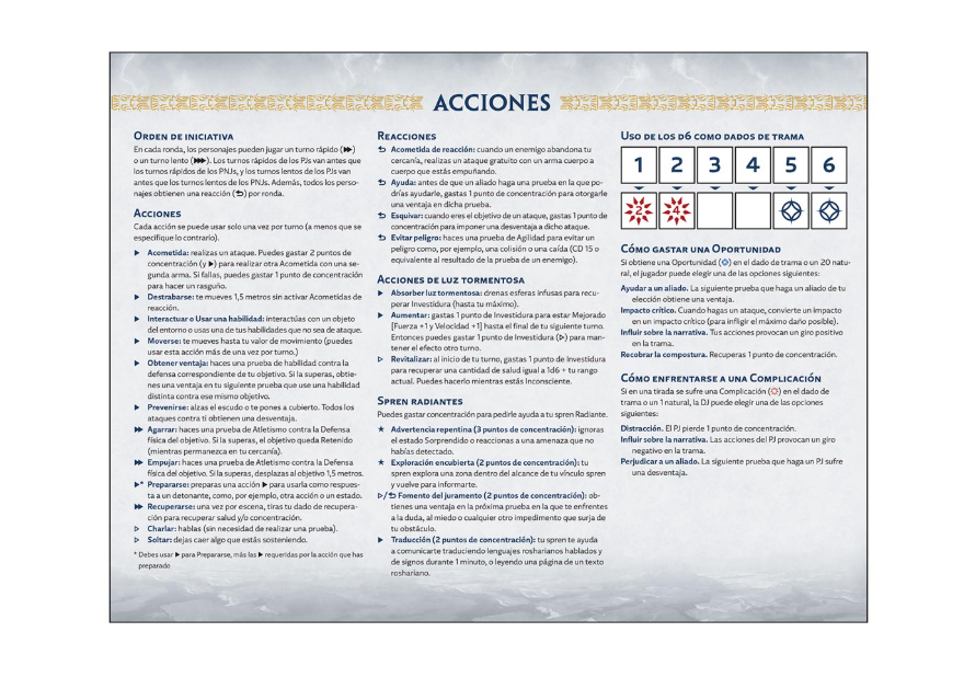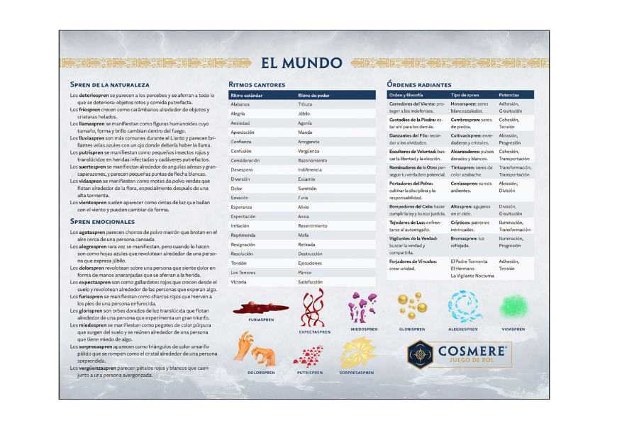Una fantástica pantalla de tres paneles que incluye un práctico resumen de las principales reglas del juego así como información relevante de la ambientación sobre las Órdenes Radiantes, los diferentes tipos de spren y ritmos de cantor para ayudar a quien dirige la partida en su labor. En el lado exterior muestra una impresionante ilustración que ayudará a ambientar tus partidas.