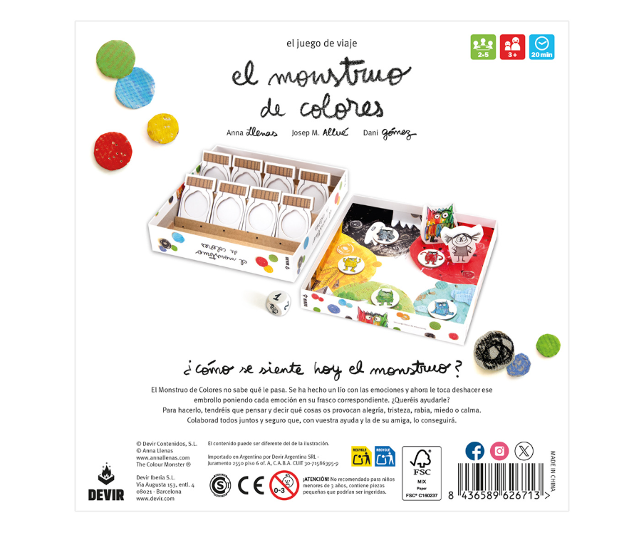 Vuelve el juego de El Monstruo de Colores… ¡Más compacto que nunca! Llega una nueva edición del juego infantil, basado en el popular cuento de Anna Llenas, con un formato ideal para llevar a cualquier parte y precio reducido. En esta versión, la caja se convierte un elemento más del juego. En el interior, una parte incorpora el tablero impreso, la otra, un inserto para acomodar los botes. ¡Jugar en un espacio pequeño ya no es un problema!