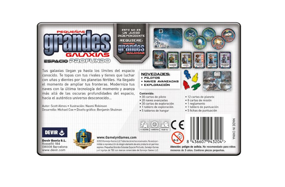 Espacio Profundo es una expansión de Pequeñas Grandes Galaxias y requiere el juego base. Diseñado por Scott Almes e ilustrado por Naomi Robinson, esta expansión puede disfrutarse en solitario o en grupos de hasta 5 jugadores, a partir de los 14 años, con partidas de aproximadamente 30 minutos. La expansión amplía el universo de Pequeñas Grandes Galaxias con nuevas mecánicas y componentes. Los jugadores tienen más opciones para ganar puntos de victoria, contratando pilotos con habilidades únicas y reuniendo insignias de exploración mientras investigan el cosmos inexplorado.