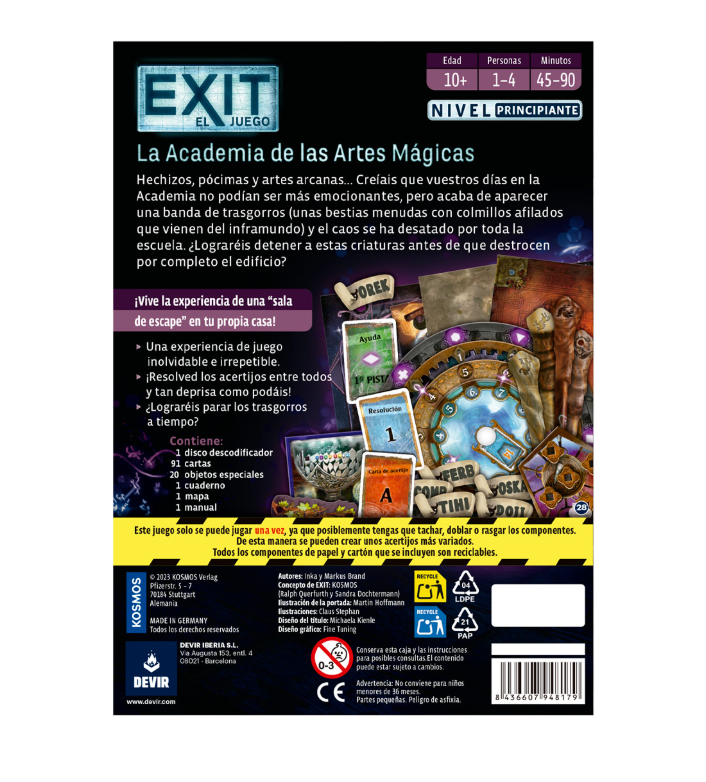 Con una dificultad de nivel principiante, Exit: La Academia de las Artes Mágicas es un título ideal para iniciarse en los juegos de escape. Prestar atención a los detalles, la buena comunicación entre los miembros del equipo y afilar la capacidad de deducción serán las claves que os permitirán tener éxito en esta aventura. ¿Lograréis devolver la academia a la normalidad?