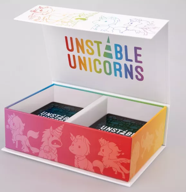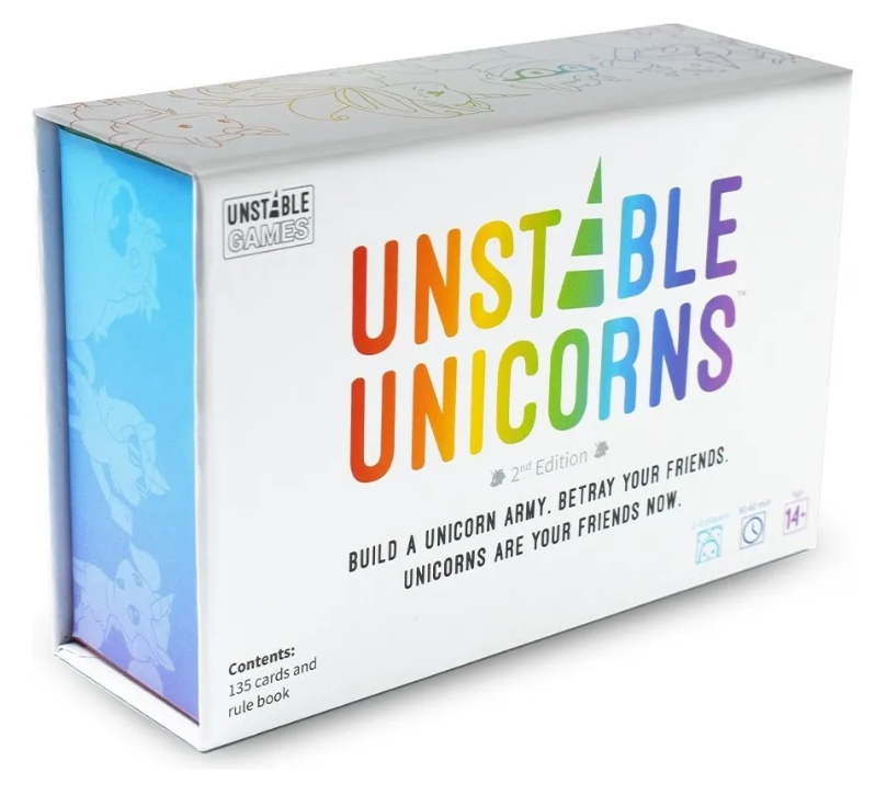Unstable Unicorns es un juego de cartas estratégico por turnos sobre tus dos cosas favoritas: los unicornios y la destrucción. ¡El primer jugador que consiga tener 7 Unicornios de cualquier tipo en su Establo será el ganador!