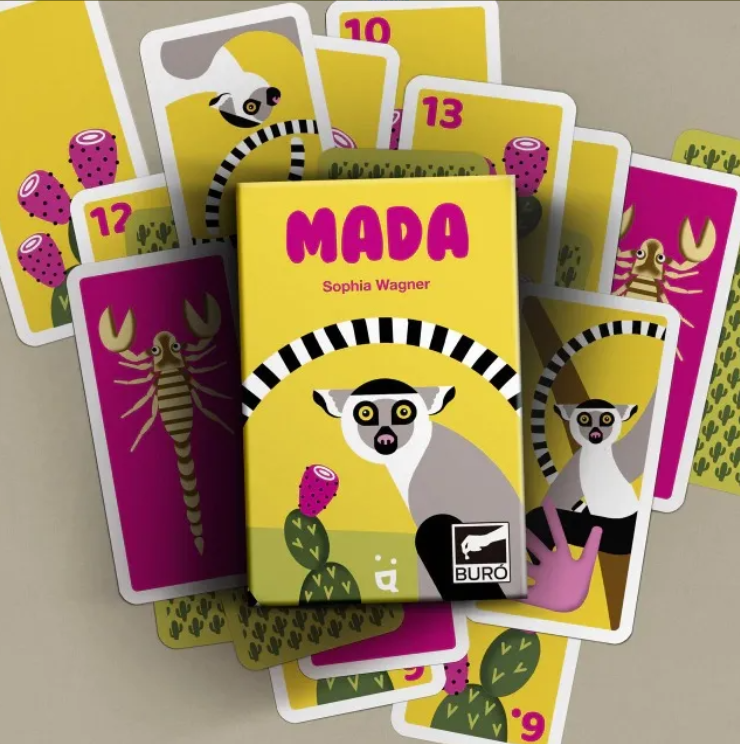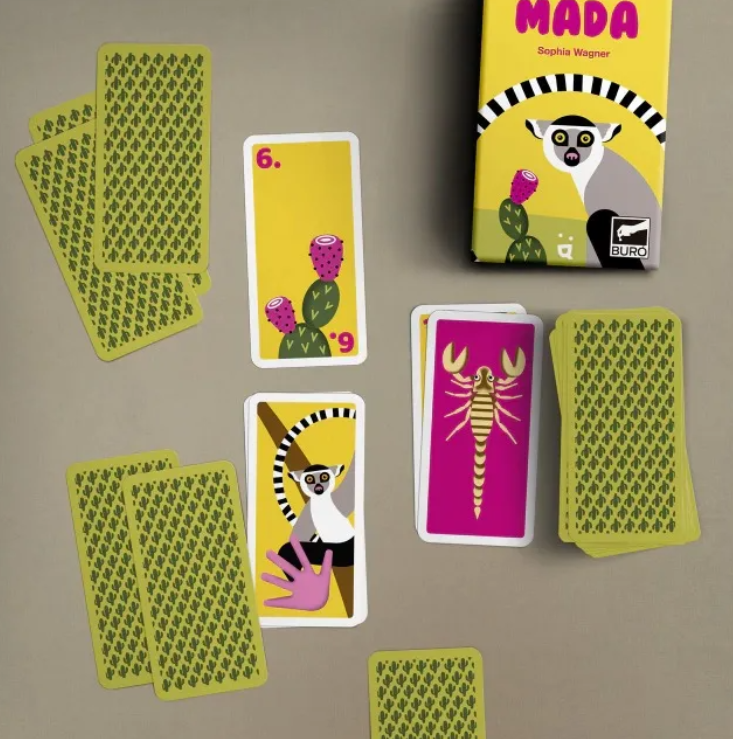 Mada es un juego de cartas dinámico en el que los participantes compiten por coleccionar la mayor cantidad de flores de cactus. Durante la partida, se encontrarán con lémures y escorpiones que podrán influir en el desarrollo del juego, ya sea asistiendo o complicando la estrategia a seguir.