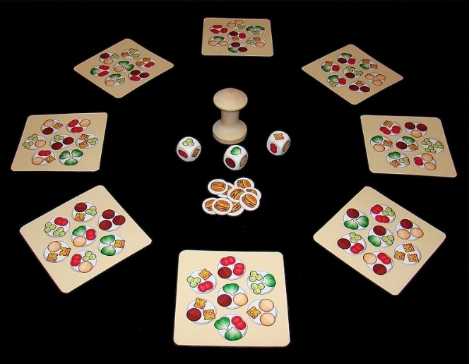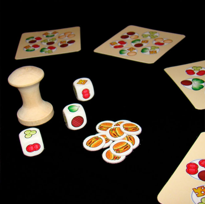 Arroja los dados, encuentra los 3 ingredientes de hamburguesa, toma el salero e indica en que plato están. Si coinciden toma una hamburguesa.