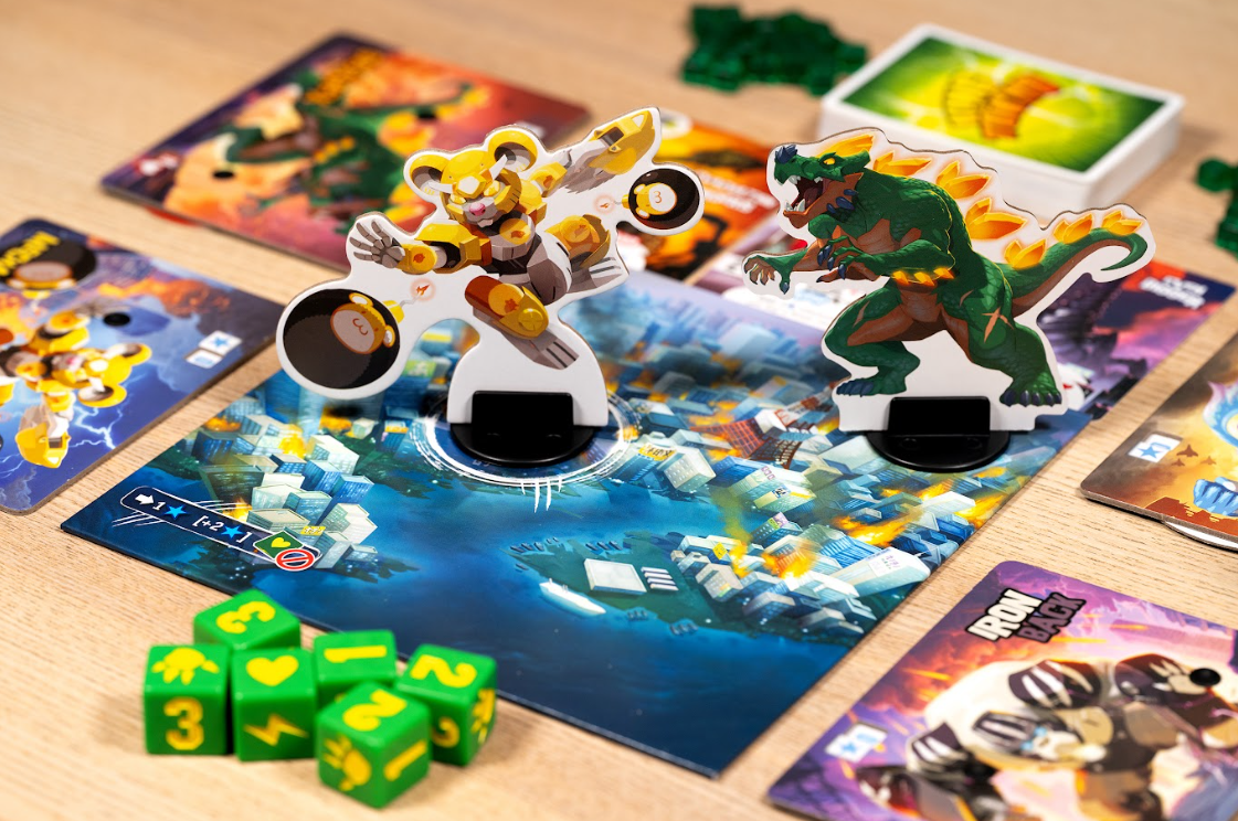 En un turno, tira seis dados con los siguientes seis símbolos: 1, 2 o 3 puntos, energía, curación y ataque. En tres tiradas consecutivas, elige si conservar o descartar cada dado para ganar puntos, ganar energía, recuperar salud o atacar a otros jugadores. Al atacar, si estás fuera de Tokio, golpeas a quien esté en Tokio; si estás en Tokio, ¡golpeas a todos los demás! Si la salud de alguien baja a 0, queda fuera de la partida. (No puedes curarte mientras estás en Tokio, y la única forma de salir de la ciudad es que alguien te ataque... lo que podría ponerte al borde de la muerte).