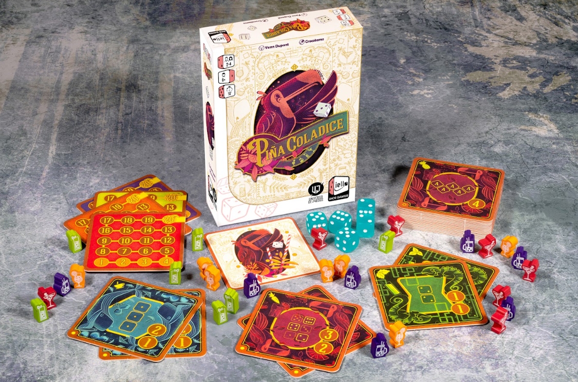 Piña Coladice es un juego familiar para fiestas en el que tiras los dados hasta tres veces para conseguir una de las combinaciones disponibles en los posavasos.