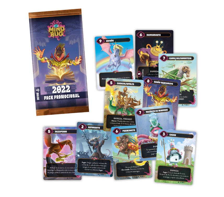 Entre las 10 nuevas cartas de esta expansión para Mindbug encontramos al Caracoltapulta, que sacrifica a una unidad aliada para derrotar a un enemigo. El parásito de Mindbug, que se cobra un punto de vida del oponente antes de que juegue un Mindbug. El Ratomante, que permite volver a activar cartas de la pila de descarte. La Cabra Saltamontesa, que añade frenesí a las cartas aliadas. El Puercohete, que una vez fuera de juego, derrota a su vez a todas las criaturas enemigas. La Babosanauta, que tiene poderes y habilidades variables según su uso. Chuck, que te pide tirar un dado y según el resultado te permite derrotar criaturas enemigas. El Jazziperro, que te ayuda a tomar el control de criaturas enemigas con su música. El Dagón guacamayo, que te permite intercambiar la mano con la del oponente. Y por último el poderoso Unigón (medio unicornio, medio dragón) que te garantiza la victoria si no tienes cartas en la mano.