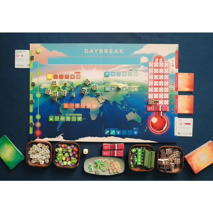 Daybreak es un juego cooperativo de 1 a 4 jugadores en el que tienes que construir tecnologías alucinantes y desarrollar sociedades sólidas y comprometidas con un planeta en pleno calentamiento. En el juego elaborarás estrategias y usarás cartas para crear poderosos combos junto a tus compañeros para descarbonizar el planeta y la sociedad.
