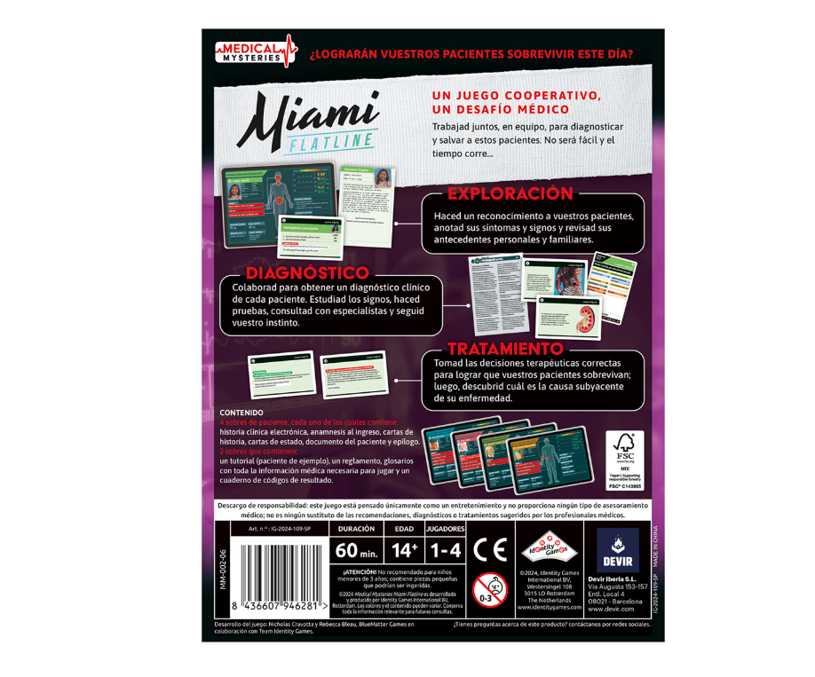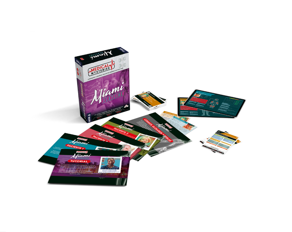 Diseñado por Rebecca Bleau y Nicholas Cravotta, Medical Mysteries: Miami es un juego cooperativo en el que trabajarán en equipo para resolver casos médicos y ayudar a sus pacientes. El tiempo corre, así que asegúrense de tomar las decisiones correctas lo más rápido posible para salvar vidas. La caja incluye un tutorial que enseña las mecánicas paso a paso, además de cuatro casos únicos, cada uno con un nivel de dificultad diferente. La clave del éxito está en la colaboración, y no se requieren conocimientos médicos para jugar.