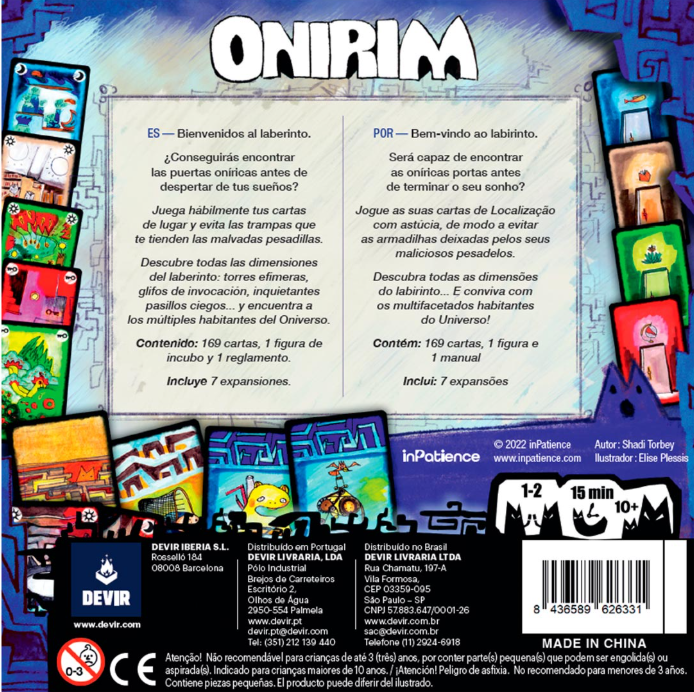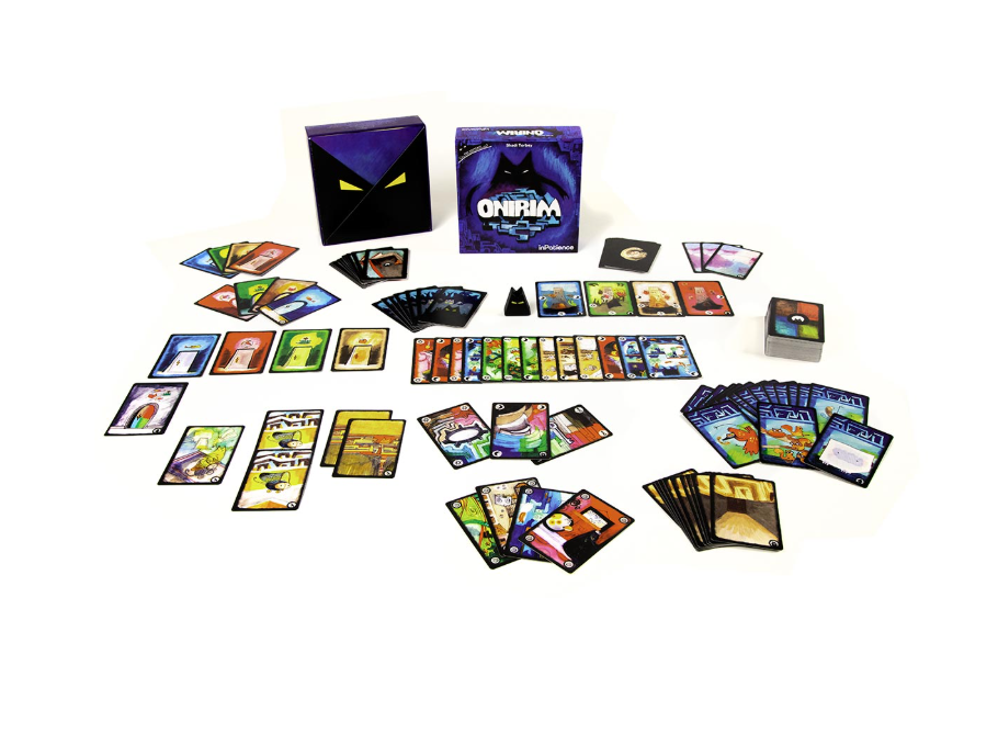 Onirim es un juego de cartas individual/cooperativo. Tú (y un compañero) debéis trabajar (juntos) contra el juego para reunir las ocho cartas de Puerta antes de que se agote el mazo; puedes obtener esas cartas de Puerta jugando cartas del mismo color tres turnos seguidos, o descartando (en circunstancias específicas) una de tus poderosas cartas de Llave. En ambos casos tendrás que decidir el mejor uso de cada carta de tu mano y jugar cuidadosamente alrededor de las Pesadillas. Esas cartas están ocultas en el mazo y desencadenarán dolorosos dilemas cuando sean robadas...