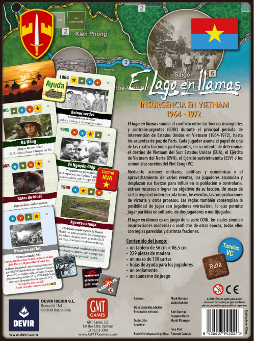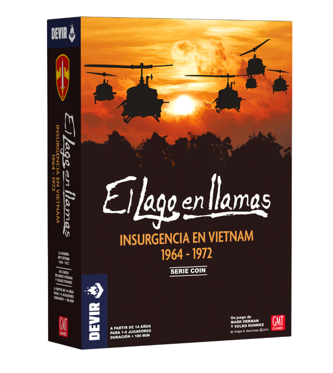 Diseñado por Mark Herman y Volko Ruhnke, El lago en llamas es un juego de mesa para 1 a 4 jugadores que simula el conflicto entre las fuerzas insurgentes y contrainsurgentes (COIN) durante el principal período de intervención de Estados Unidos en Vietnam (1964-1972), hasta los acuerdos de paz de París. Cada jugador asume el papel de una de las cuatro facciones participantes, en su intento de determinar el destino de Vietnam del Sur: Estados Unidos (EUA), el Ejército de Vietnam del Norte (EVN), el Ejército sudvietnamita (ESV) o los comunistas sureños del Viet Cong (VC).