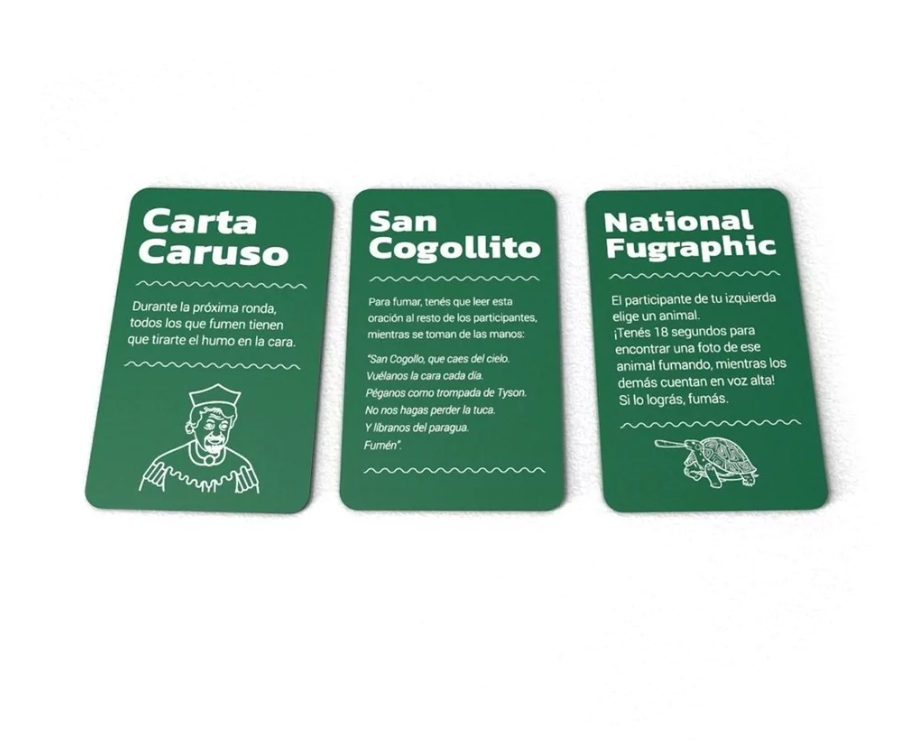 ¿Cómo se juega? Es muy simple: cada carta tiene una consigna para que fume uno, todos o nadie. Por ejemplo imitar a Shakira, rezarle a San Cogollito o hacer un Kame-Kame-Ha de humo.