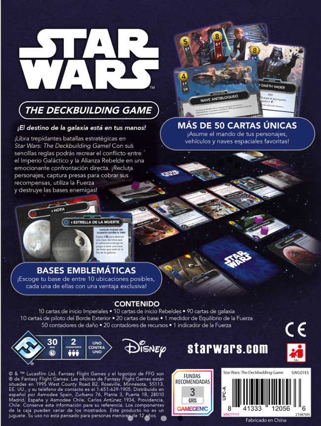 ¡El destino de la galaxia está en tus manos! ¡Libra trepidantes batallas estratégicas en Star Wars: The Deckbuilding Game! Con sus sencillas reglas podrás recrear el conflicto entre el Imperio Galáctico y la Alianza Rebelde en una emocionante confrontación directa. ¡Recluta personajes, captura presas para cobrar sus recompensas, utiliza la Fuerza y destruye las bases enemigas!