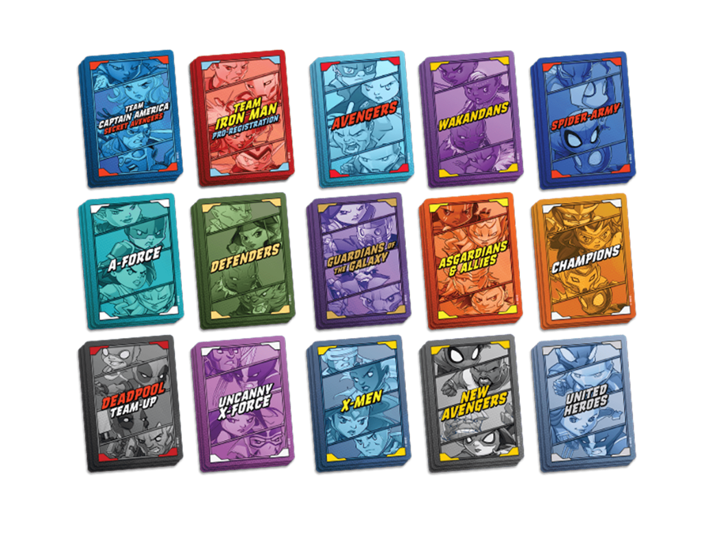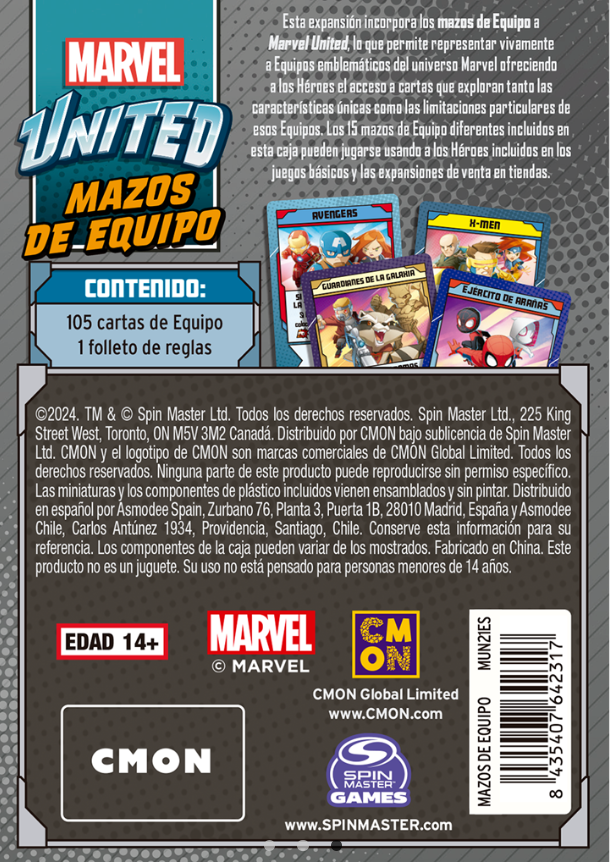 Esta expansión incorpora los mazos de Equipo a Marvel United, lo que permite representar vivamente a Equipos emblemáticos del universo Marvel ofreciendo a los Héroes el acceso a cartas que exploran tanto las características únicas como las limitaciones particulares de esos Equipos. Los 15 mazos de Equipo diferentes incluidos en esta caja pueden jugarse usando a los Héroes incluidos en los juegos básicos y las expansiones de venta en tiendas.