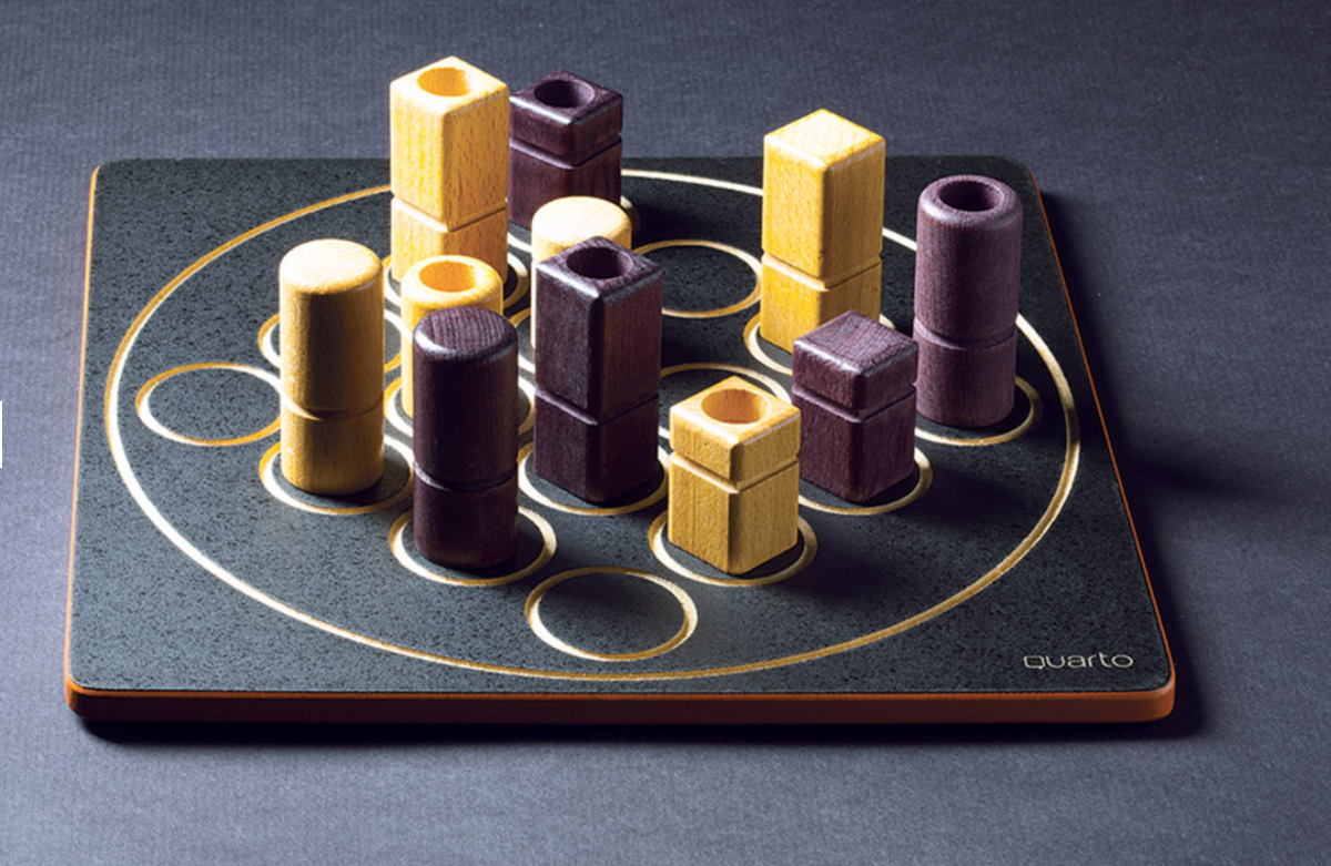 El Quarto es un juego de mesa abstracto que ya es considerado un clásico. Las 16 piezas tienen 4 atributos distintos: altura (alta o baja), color (clara u oscura), forma (redonda o cuadrada) y relleno (liso o hueco) . El objetivo del juego es alinear 4 piezas con una característica común. El problema es que uno no elige las piezas que va a jugar, ¡tu rival las elige por vos!