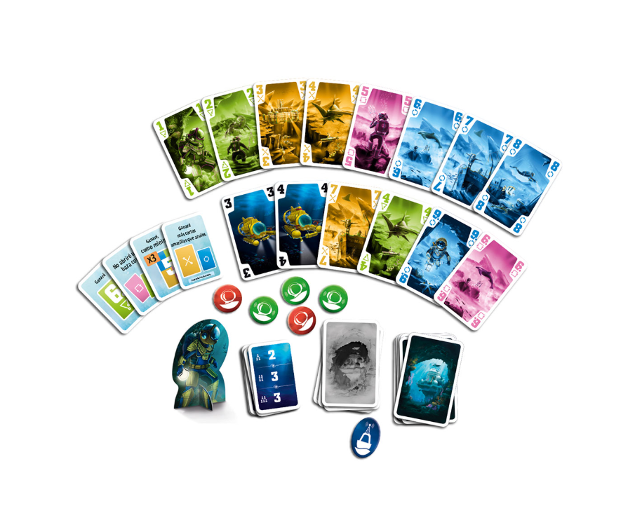 Con unas reglas fáciles de entender y de explicar y una preparación muy rápida, enseguida os pondréis a jugar. La caja incluye por un lado una baraja de 40 cartas, numeradas del 1 al 9, de cuatro colores distintos más cuatro cartas de submarino, numeradas del 1 al 4, que actúan de comodines con el valor más alto; por el otro, un mazo con cartas de misión, donde se indica una puntuación en función del número de jugadores. Dependiendo de la dificultad de cada aventura, será necesario completar más o menos misiones.