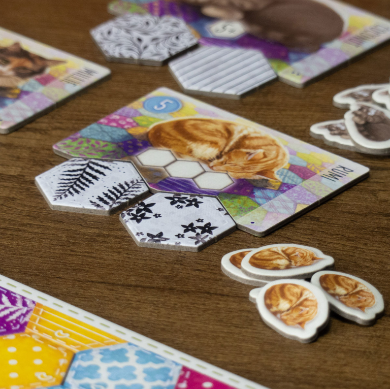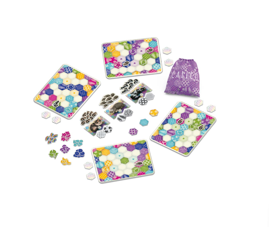 En Calico, los jugadores compiten para tejer la colcha mas cómoda cogiendo y colocando parches de diferentes colores y estampados en su tablero de colcha. Cada tablero tendrá 3 objetivos de diseño que otorgarán puntos si se cumplen sus requisitos. Los jugadores intentarán además crear grupos de estampados para atraer a los gatos más adorables y grupos de colores en los que coser botones. ¡El jugador que obtenga más puntos por sus diseños, gatos y botones, gana la partida.