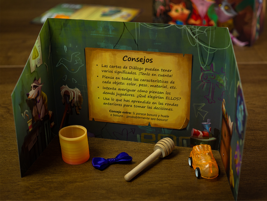 Palabras basura es un juego cooperativo de asociación de palabras en el que mapaches y gatos intentan comunicarse entre ellos emparejando cartas de diálogo y extraños objetos que han encontrado en la basura. Trabajad en equipo para superar las rondas, que serán progresivamente más difíciles, y así ganar la partida.