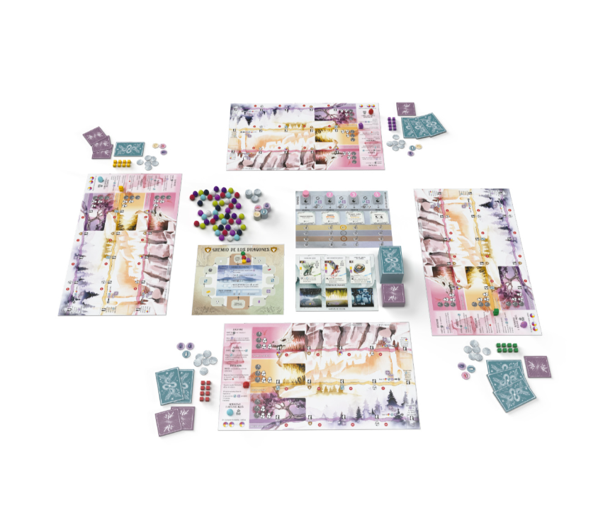 En Wyrmspan construirás un santuario para dragones. Tu santuario empieza con 3 espacios excavados a la izquierda en tu Caverna Carmesí, Gruta Gualda y Abismo Amatista. Durante la partida, excavarás más espacios en tu santuario y atraerás a dragones para que vivan en él, encadenando potentes habilidades y ganándote el favor del Gremio de los dragones.