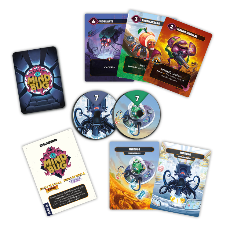 Frutas y verduras de ciencia ficción llegan a tus manos para disputar combates galácticos épicos. Este nuevo set de Mindbug es completamente independiente, pero también se puede combinar con otras ediciones del juego. Además de las 52 cartas nuevas, esta edición incorpora 12 fichas de Octonita que sirven para activar habilidades únicas.