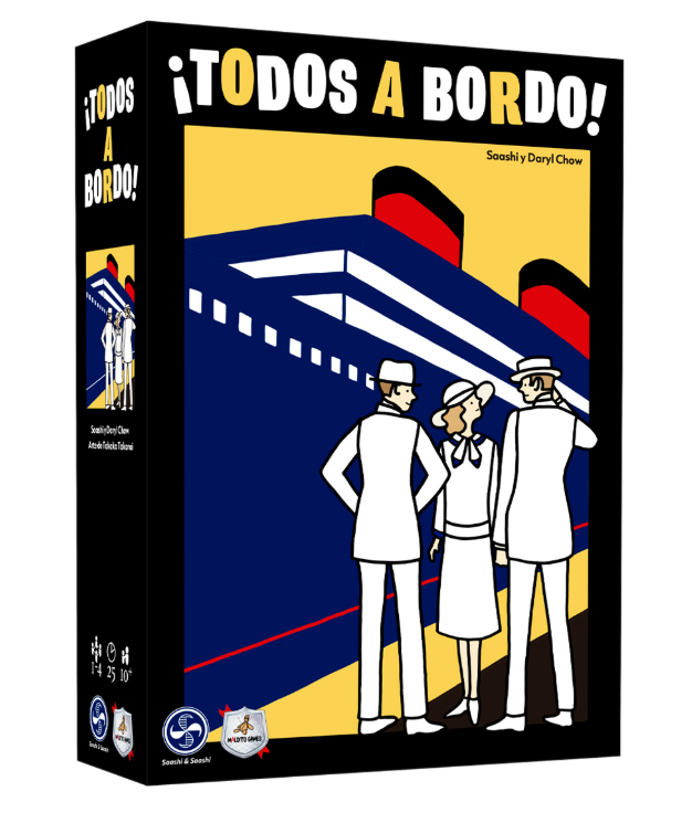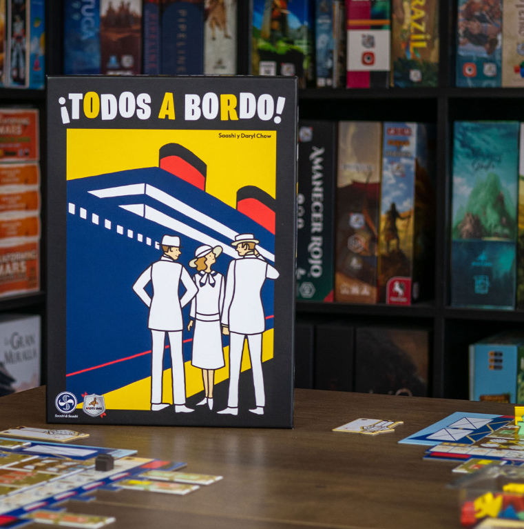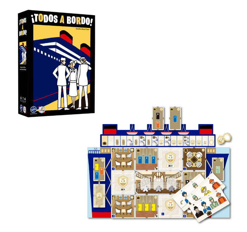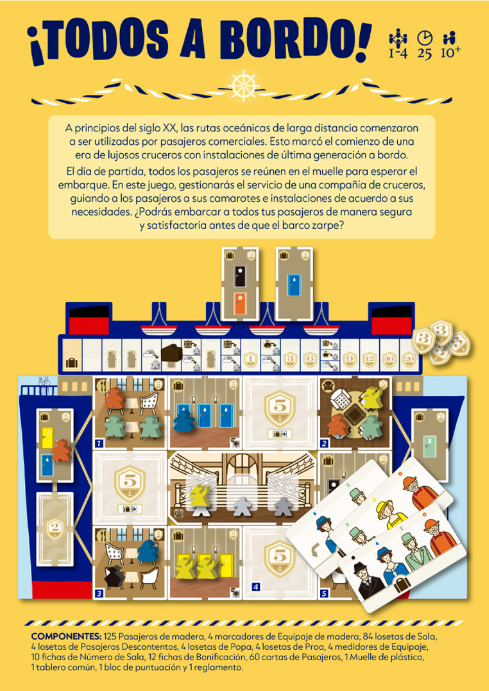 ¡Todos a bordo! es un juego de mesa para 1 a 4 jugadores en el que compites para subir pasajeros en tu crucero de lujo, llevándolos a sus camarotes y salas favoritas. Los jugadores pueden disfrutar de un juego delicioso, reflexivo, brillantemente ilustrado, de reglas sencillas, pero de desarrollo desafiante.
