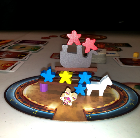 Combo Meeple Circus base junto a dos de sus expansiones: Espectáculo Aéreo y de Animales Salvajes y El Espectáculo Debe Continuar.