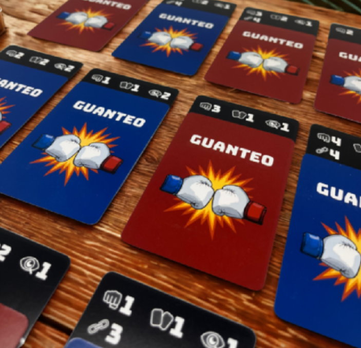 En Guanteo, dos jugadores se enfrentan en un ring de 16 cartas dispuestas al azar. Cada uno comienza con el control de 8, pero solo quien logre quedarse con 12 cartas al final de su turno será el campeón.