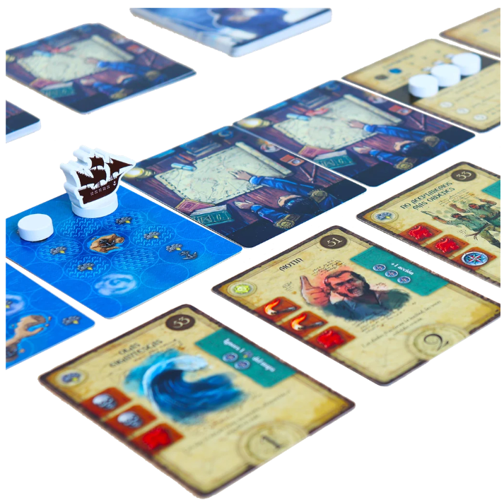 Adamastor es un juego solitario de gestión de cartas multiuso donde deberás buscar el equilibrio para que los contratiempos en forma de enfermedades, motines, escasez y traumas no pesen más que la esperanza y la sed de aventuras, consiguiendo así llevar tu embarcación hasta su destino final.