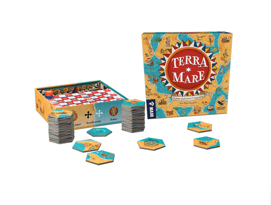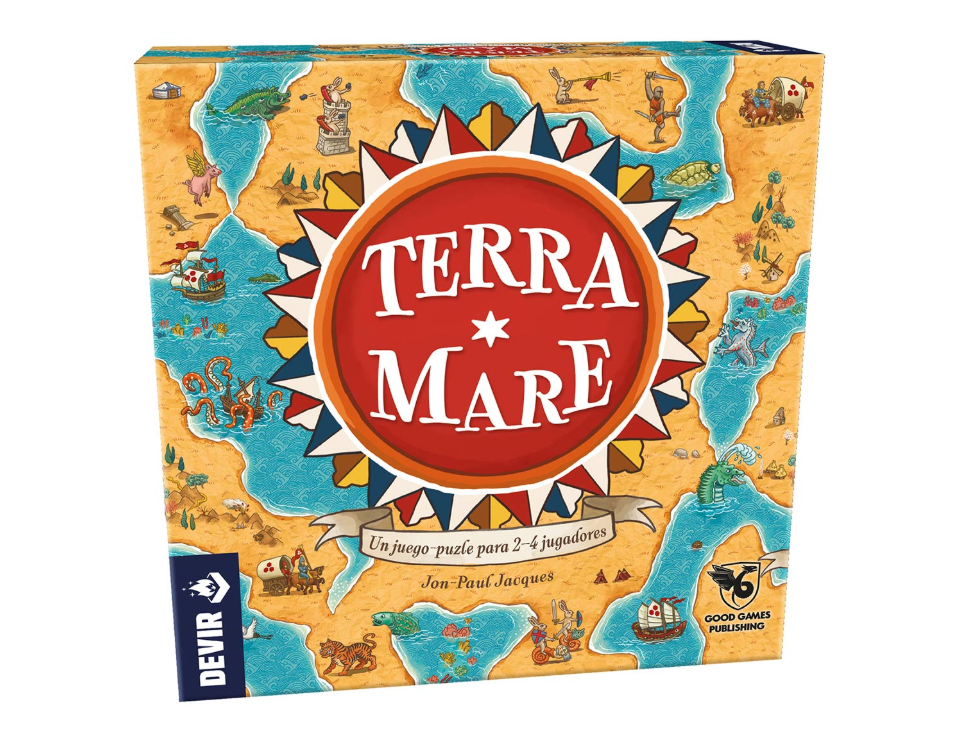 Espera un momento... ¿Estás seguro de que en este lugar había agua? ¿No se extendían las lejanas tierras de los dragones? Ponte en la piel de célebres cartógrafos medievales y completa un mapa único en Terra Mare. A medio camino entre un puzzle y un juego de mesa, este título desafía a conseguir la máxima puntuación colocando losetas hexagonales que van creando un mapa con secciones de tierra y otras de mar, repletas de miniaturas y detalles. Diseñado e ilustrado por Jon-Paul Jacques, este juego permite partidas para 2, 3 o 4 jugadores, a partir de 14 años, de unos 40 minutos de duración.