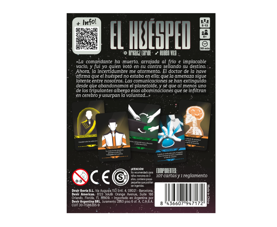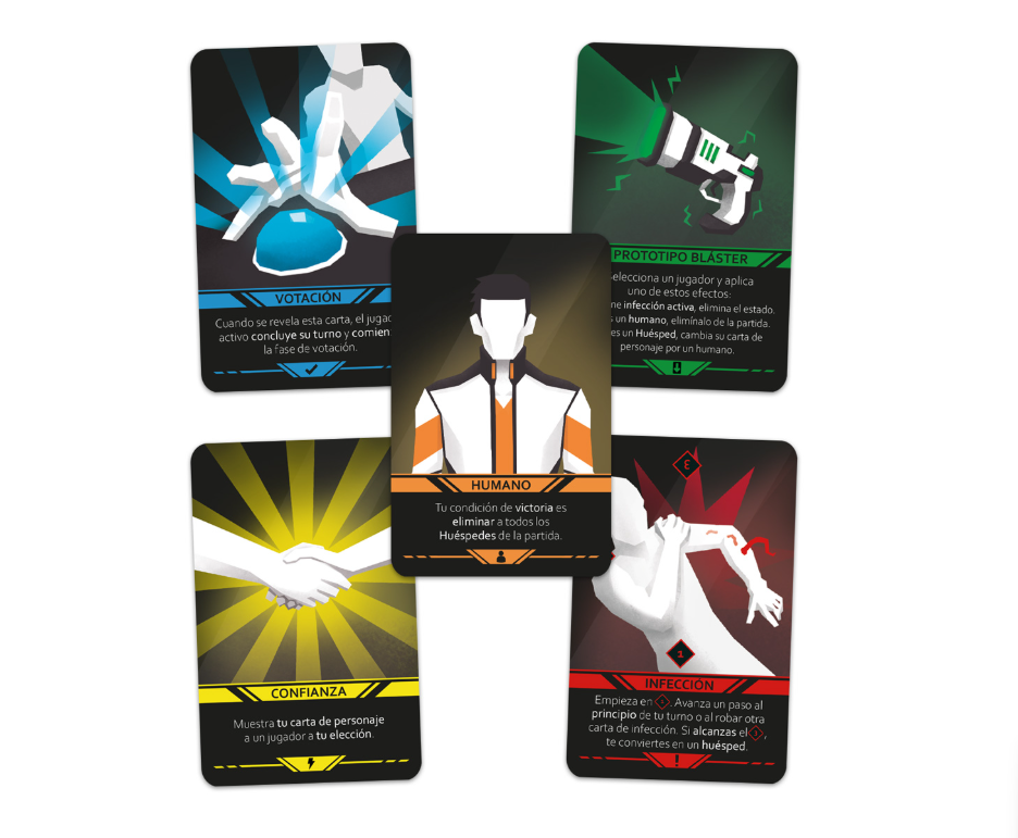Diseñado por Arkaitz Caride e ilustrado por Rubén Vila Suárez, El Huésped se puede jugar en grupos grandes de entre 5 y 12 jugadores, a partir de 8 años, en partidas de unos 30 minutos de duración. En este juego de roles ocultos, el objetivo de los jugadores consiste en sobrevivir, siendo el último en pie o eliminando al grupo contrario.