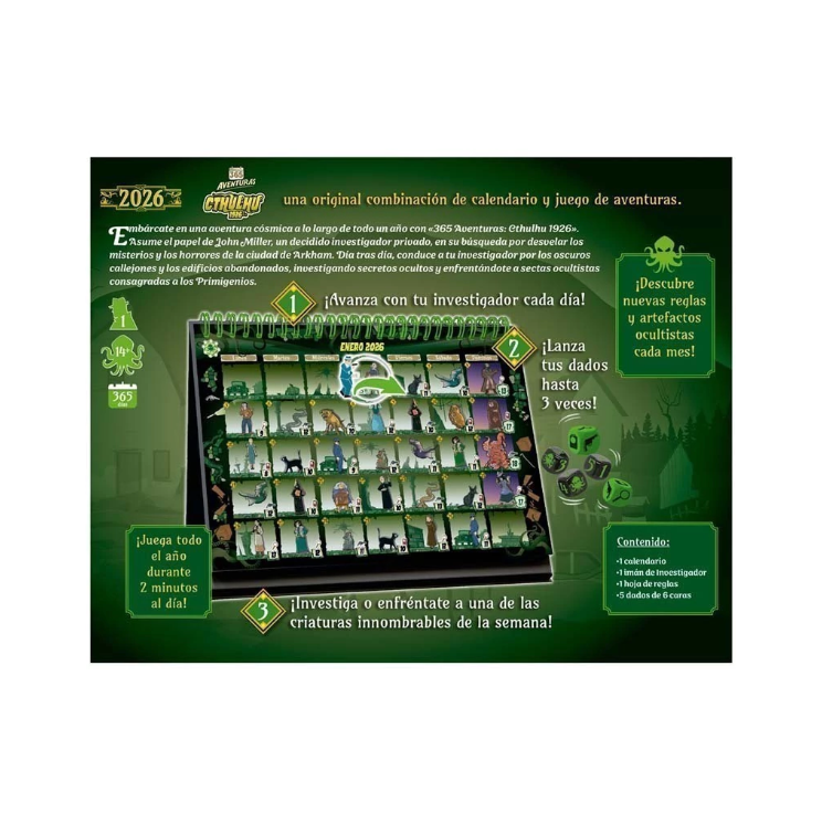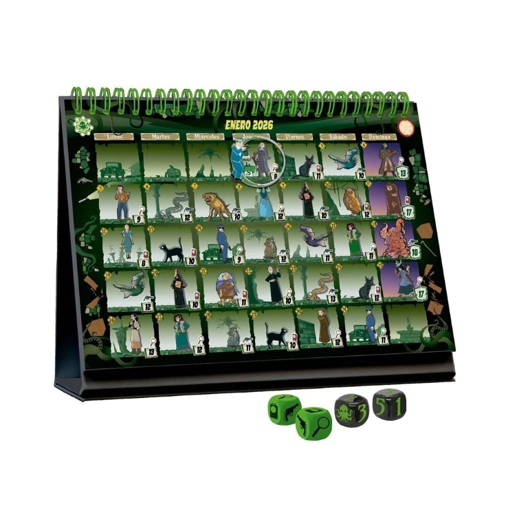Diseñado por Juhwa Lee e ilustrado por Radja, este calendario está pensado para disfrutar en solitario, a partir de 14 años. Jugar solamente llevará dos minutos al día, pero el desafío completo se prolonga a lo largo de los 365 días del año. Para marcar el día en curso, usarás una figura de investigador y un imán en la parte trasera de la hoja del mes.