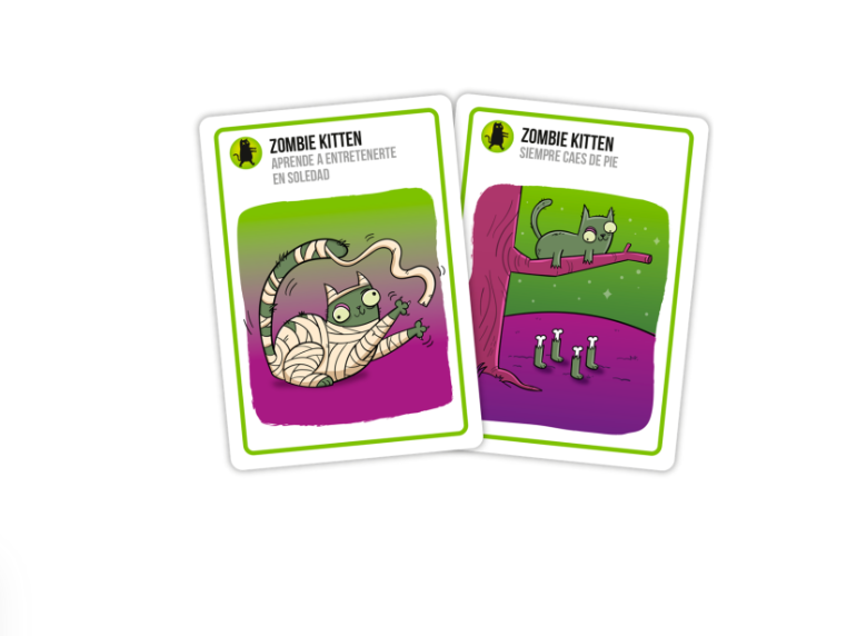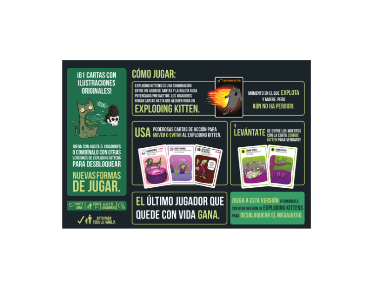 Usa las cartas de acción para mover y evitar al Exploding Kitten y levántate entre los muertos con la carta Zombie Kitten para vengarte.