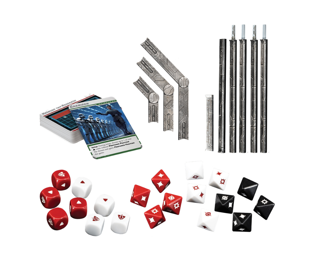 37 miniaturas, 7 cartas de Unidad, 15 cartas de Mejora, 10 cartas de Mando, 24 cartas de Batalla, 4 dados rojos de ataque, 4 dados negros de ataque, 4 dados blancos de ataque, 4 dados rojos de defensa, 4 dados blancos de defensa, 3 láminas de fichas, 1 hoja de información, 1 juego de plantillas de movimiento (larga, mediana y corta), 1 juego de reglas de alcance (½ y 1, en 5 segmentos)