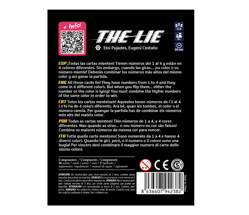 Con muy pocas reglas y muchísima rejugabilidad, The Lie es un juego ideal para cualquier clase de jugador o grupo de juego. Los más pequeños aprenderán a formar combinaciones numéricas, mientras que los mayores encontrarán un gran reto en la gestión de las cartas para quedarse rápidamente con la mano vacía. Y todo ello aderezado con un punto de azar, gracias al “reverso mentiroso” de las cartas. ¿Preparados para jugar con los números?